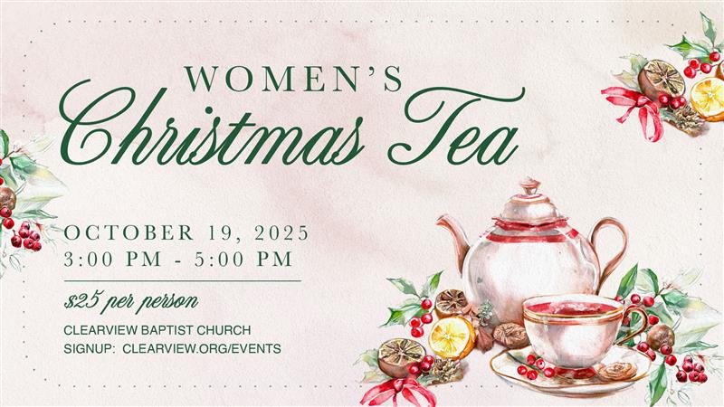Portal Public expand_more Public Event Calendar Online Giving Group Finder Opportunity Finder Mission Trip Giving Mission Trip Registration Make A Pledge Find Group by Survey Find Opportunity by Survey Private expand_more Private My User Account My Giving My Purchase History My Contribution Statement My Groups My Events My Mission Trips My Subscriptions My Profile Church Directory My Calls My Pledges Show Summary (0) anonymous Login Event Details Women's Christmas Tea Back to Calendar Join us for our annual Women’s Christmas Tea, a cherished tradition for women of all ages. This elegant afternoon will include tea and refreshments, fellowship with friends old and new, and an encouraging message from Teasi Cannon. In addition to celebrating together, we’ll continue our missions partnership with Western Heights Children’s Home by providing Christmas gifts for the children. We invite you to prayerfully consider how you might participate in this meaningful opportunity to bless others. Bring a friend and enjoy this special time of connection and celebration. Ministry Area: Women's Ministry Dinner/Tea When: Sunday, October 19, 20253:00 PM - 5:00 PM Add To Calendar Where: ClearView Baptist Church | 537 Franklin Rd.537 Franklin RoadFranklin, TN 37069 Map This Meeting Instructions: Contact: Thomas, Nancy Sign Up!